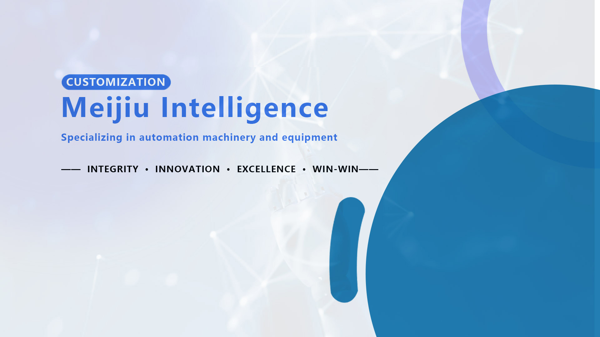 Ningbo Meijiu Intelligent Equipment Co., Ltd. specializes in the research, development, production and sales of industrial non-standard automation machinery and equipment. Founded in April 2014, it has a team of 25 people with strong technical force in design, assembly and debugging, including 8 mechanical designers, 2 electrical engineers and 15 installation and debugging technicians.The company is committed to solving and realizing high-efficiency, high-quality, low-cost and fully automated production operations, saving resources and improving efficiency for enterprises of all walks of life, and achieving harmony and win-win for society and customers.Business projects:Focus on the development and production of automatic production lines for automobile parts.An automated production line focusing on the development and production of medical products.Focus on the development and production of automatic production lines for relays.Focus on the development and production of automatic production lines for various switches and sockets.Focus on the development and production of automatic production lines for fire alarm products such as temperature and smoke.Customized production: develop different fully automatic machines according to the needs of different customers.
